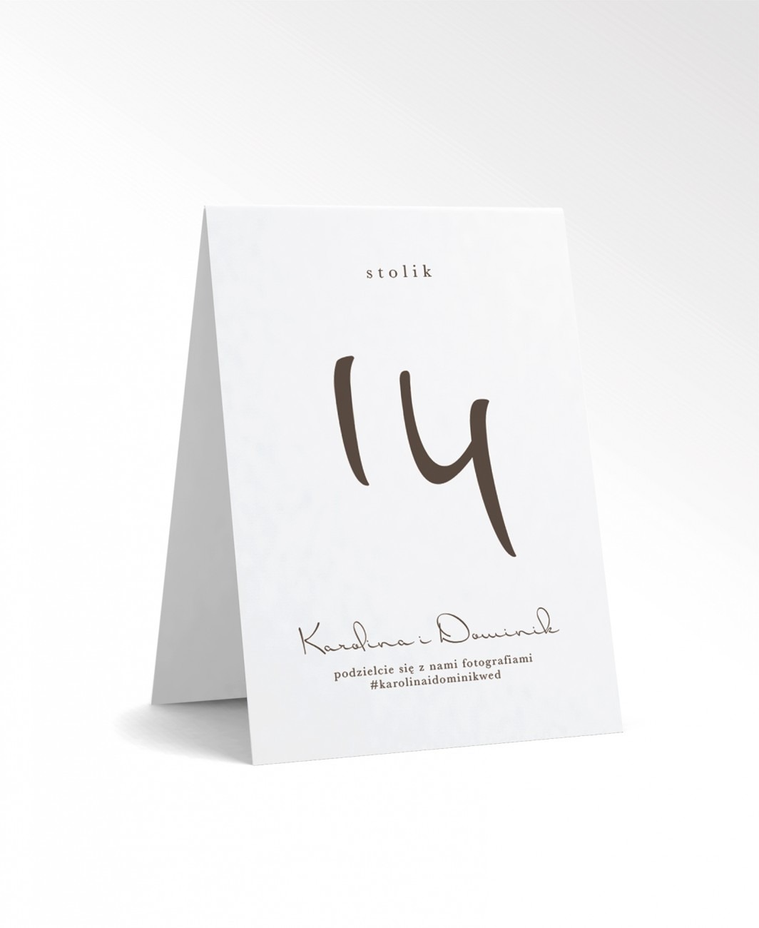 Nasze numery stołów dostępne są w dwóch wariantach: klasycznej, pojedynczej karcie o formacie 10x15 cm oraz wersji składanej, w której jedna strona zawiera numer stołu, a druga – Waszą fotografię. Ta druga opcja cieszy się dużym zainteresowaniem, bo goście bardzo ciepło reagują na tak osobisty akcent, a zdjęcie na stole staje się ciekawym tematem do rozmów.